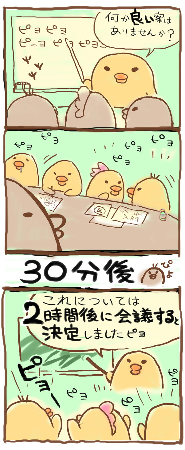 | 会議 会議が長いと、「いいこと」あ る の か な。 ディスカッションと会議の似ていないところはどこかな。 なんて「うつらうつら」しながら、気がつくと やらなければと思う会議より、普段のコミュニケーションが 不足しているのかな。と思う。 60人が 一人 1分づつ話すと・・話終わっただけで1時間過ぎているのかな。 誰もが知っているはずの「正しいことは」グルグルまわって 元の位置 解決には「失敗と」「実行の山」が必要なので 解決のてがかり・てがかり・てが かかる てが かかり すぎている? 時間が無いのかな 会議のしすぎで? |